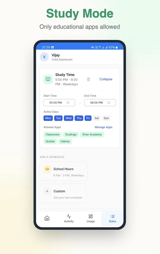 Activate study mode during homework time. Only educational apps (Google Classroom, Vedantu, Unacademy) work. Everything else blocked until study time ends.